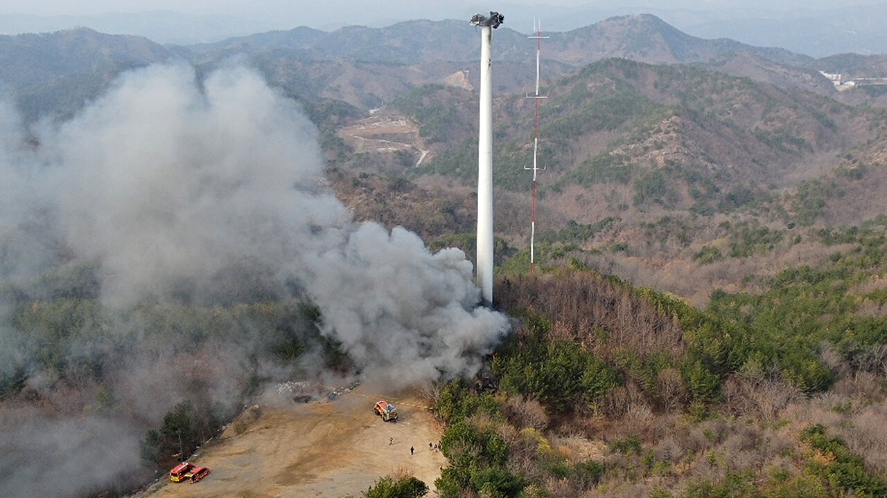 ▲ 지난달 26일 경북 영덕군 영덕읍 영덕풍력발전단지 내 풍력발전기 19호기에서 블레이드(날개)가 발전기와 분리돼 추락하는 과정에서 불이 나고 있다