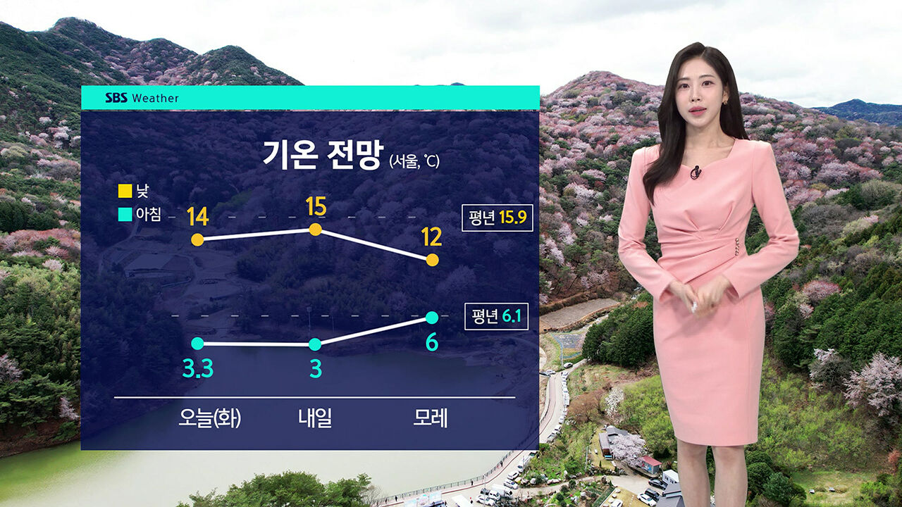 내일 아침 기온은 춘천 0도, 광주 1도까지 떨어지겠고요, 낮 기온은 광주 19도까지 오르며 일교차가 크겠습니다.