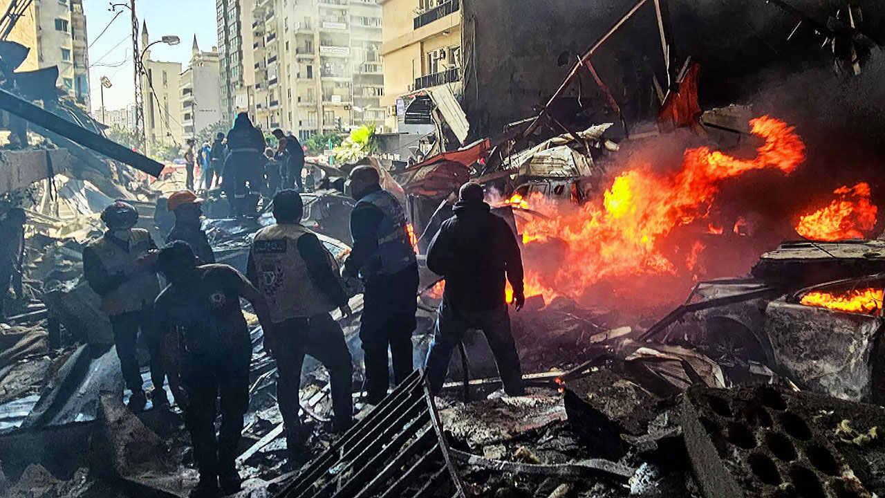 폭격을 받은 건물은 폭삭 주저앉았고, 근처 차량은 모두 불에 타버렸습니다.