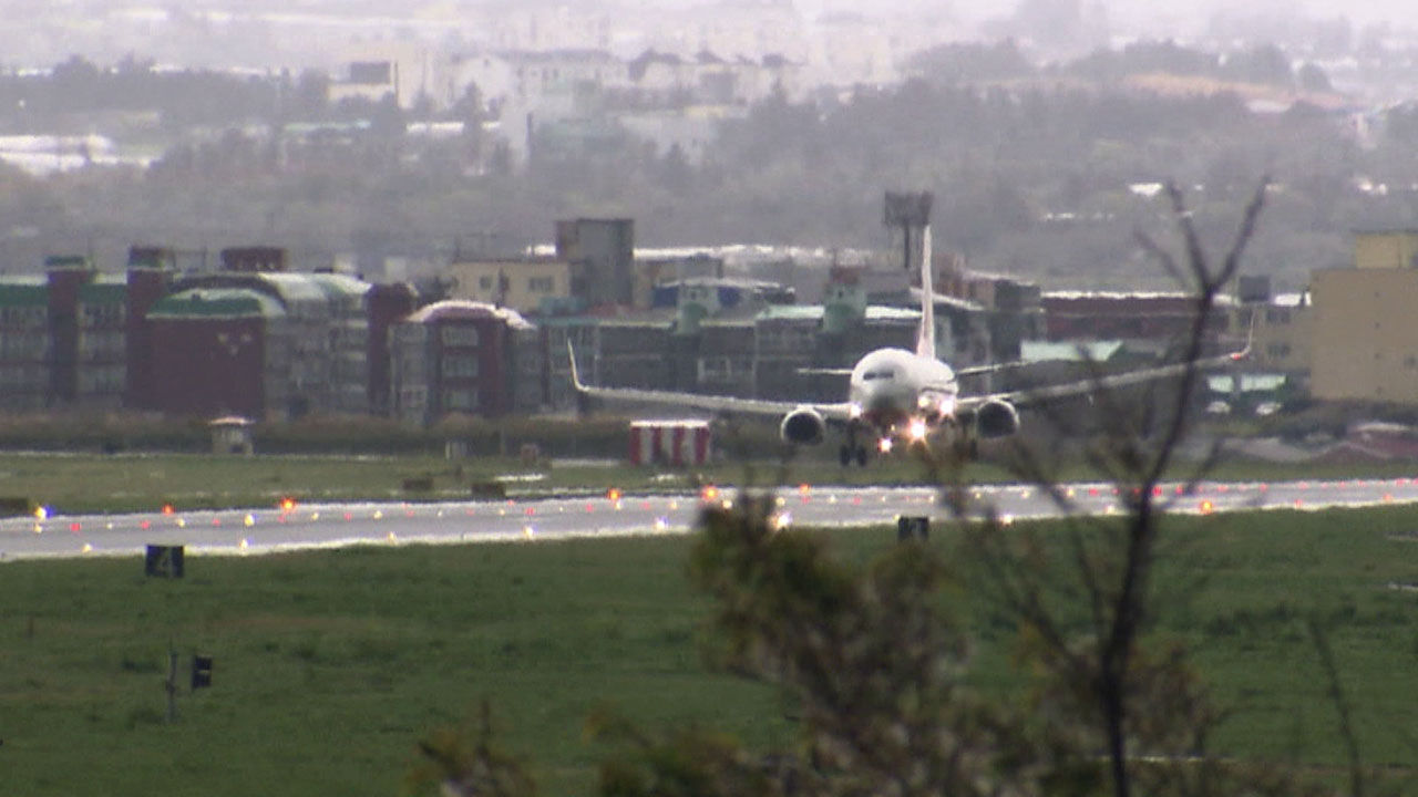 강한 바람에 기체가 휘청이며 가까스로 내려앉습니다.