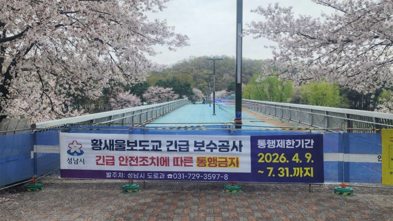경기 성남시는 탄천을 횡단하는 수내동 황새울보도교의 구조 안전성에 결함이 확인돼 9일부터 교량 통행을 전면 금지했다고 오늘(10일) 밝혔습니다.