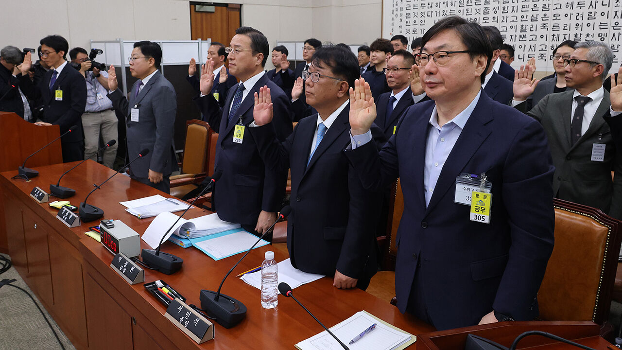 ▲ 14일 국회 국정조사특별위원회에서 열린 쌍방울 대북 송금 사건 관련 청문회에서 이화영 전 경기도 평화부지사, 서민석 변호사 등이 증인선서를 하고 있다.