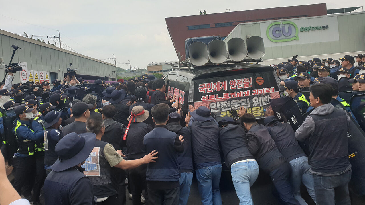 화물연대 관계자는 "사측이 경찰 뒤에 숨어 대화하지 않으려고 해서 강제 진입을 시도했다"고 전했습니다.