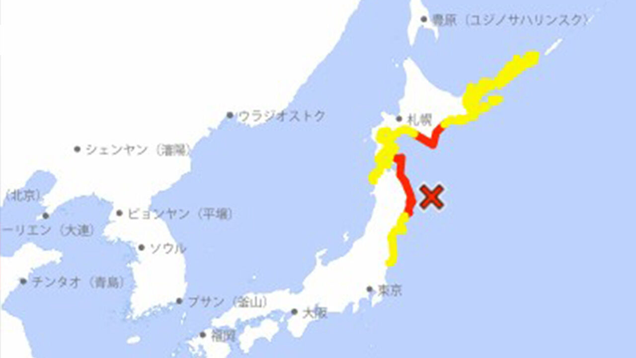 ▲ 일 혼슈 동쪽 앞바다 지진으로 쓰나미 경보·주의보, 빨간색이 경보, 노란색이 주의보 대상 지역
