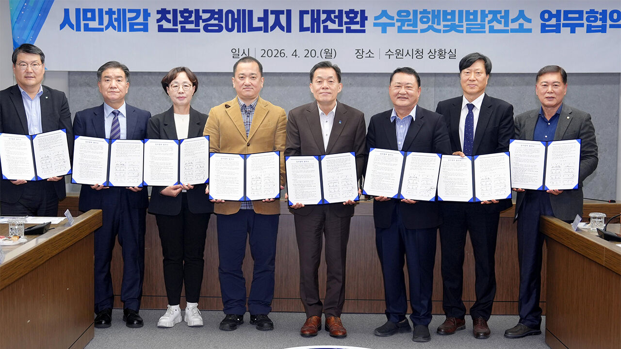 수원시는 어제(20일) 시청에서 수원도시공사, 수원시민햇빛발전 사회적협동조합, 수원상공회의소, 수원산업단지관리공단 등과 수원햇빛발전소 건설·활성화를 위한 업무협약을 체결했습니다.
