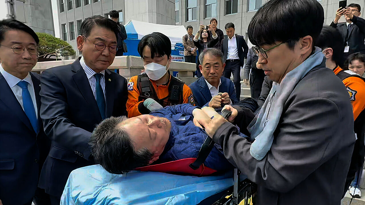 ▲ 6·3 지방선거 더불어민주당 전북지사 경선에서 이원택 후보에게 패배한 뒤 단식에 돌입한 안호영 의원이 22일 국회 본청 앞 천막 농성장에서 병원으로 이송되고 있다.
