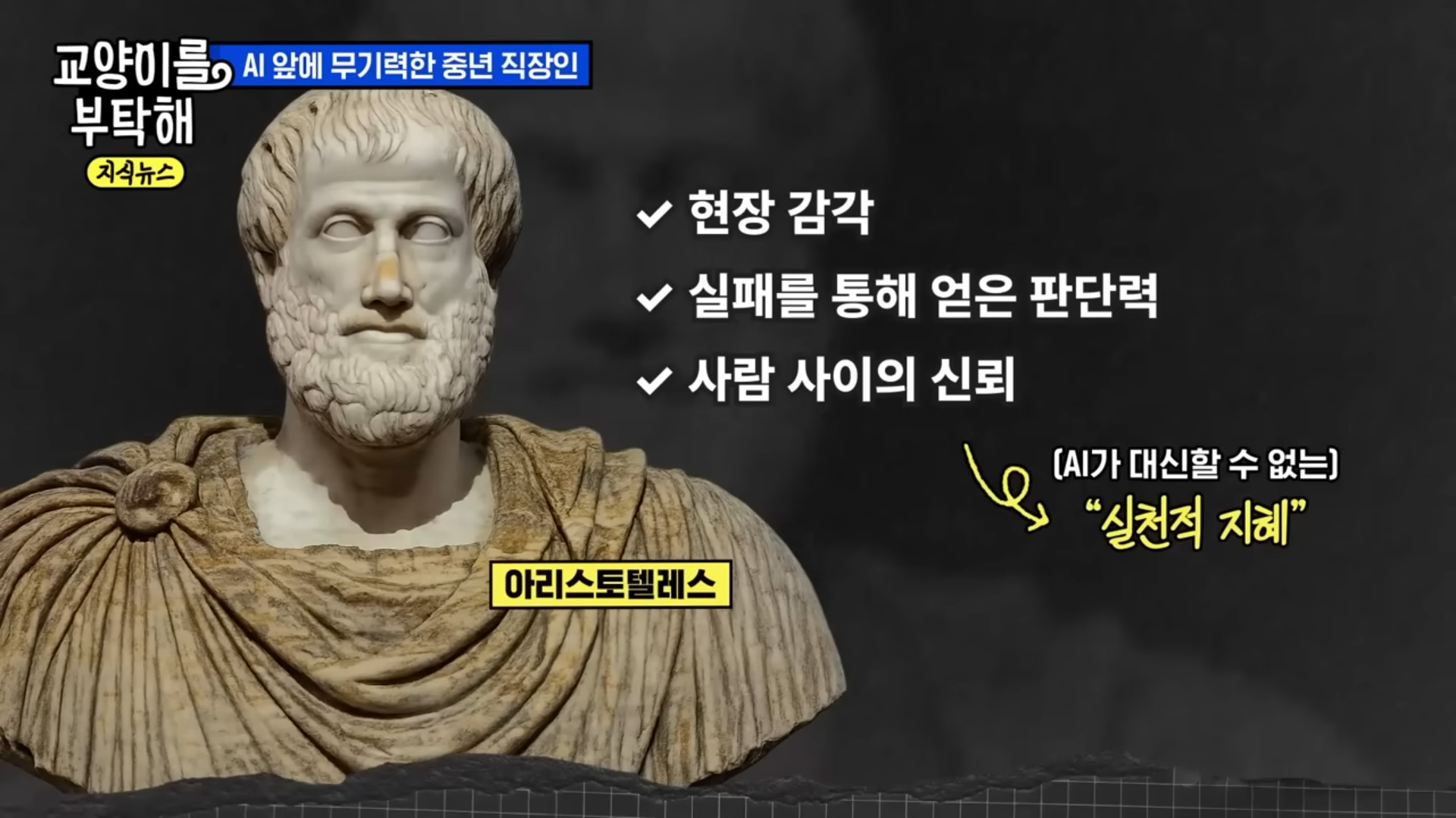 아리스토텔레스가 제가 말한 현장 감각, 상황 판단 능력, 사람 사이의 신뢰감 이것들을 합쳐서 한 단어로 정의를 했었어요. 이게 실천적인 지혜라고, 현명해지는 거라고 얘기를 했었죠. 그 현명함에 대한 자신감. 그게 내 자존감을 지켜 나갈 거라는 걸 잊지 않았으면 합니다.
