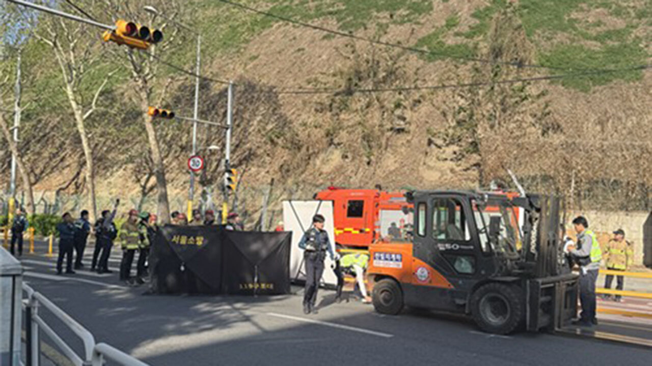 ▲ 24일 오전 8시쯤 서울 양천구 목동의 한 도로에서 지게차를 몰고 신호 위반을 하던 60대 남성이 자전거를 타고 가던 40대 여성을 들이받아 숨지게 해 경찰에 붙잡혔다