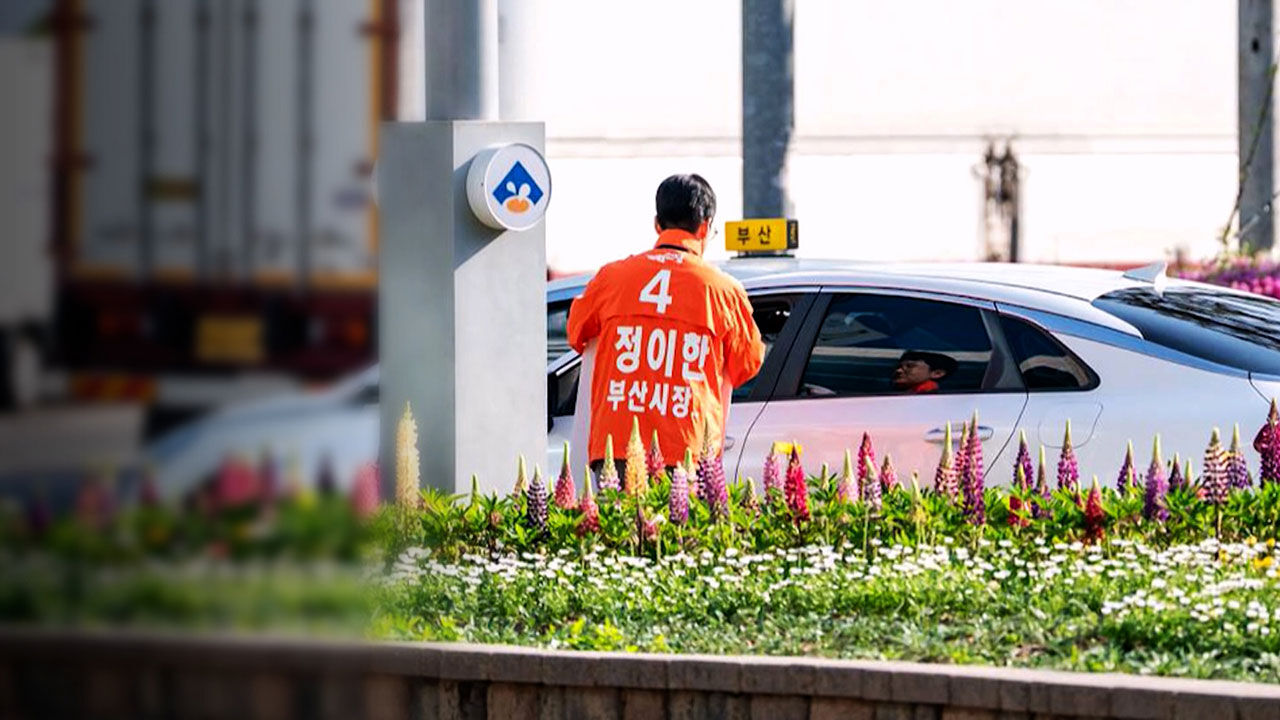 오늘 아침 8시쯤 부산 금정구의 한 교차로에서 선거 유세를 하고 있던 정이한 개혁신당 부산시장 후보.