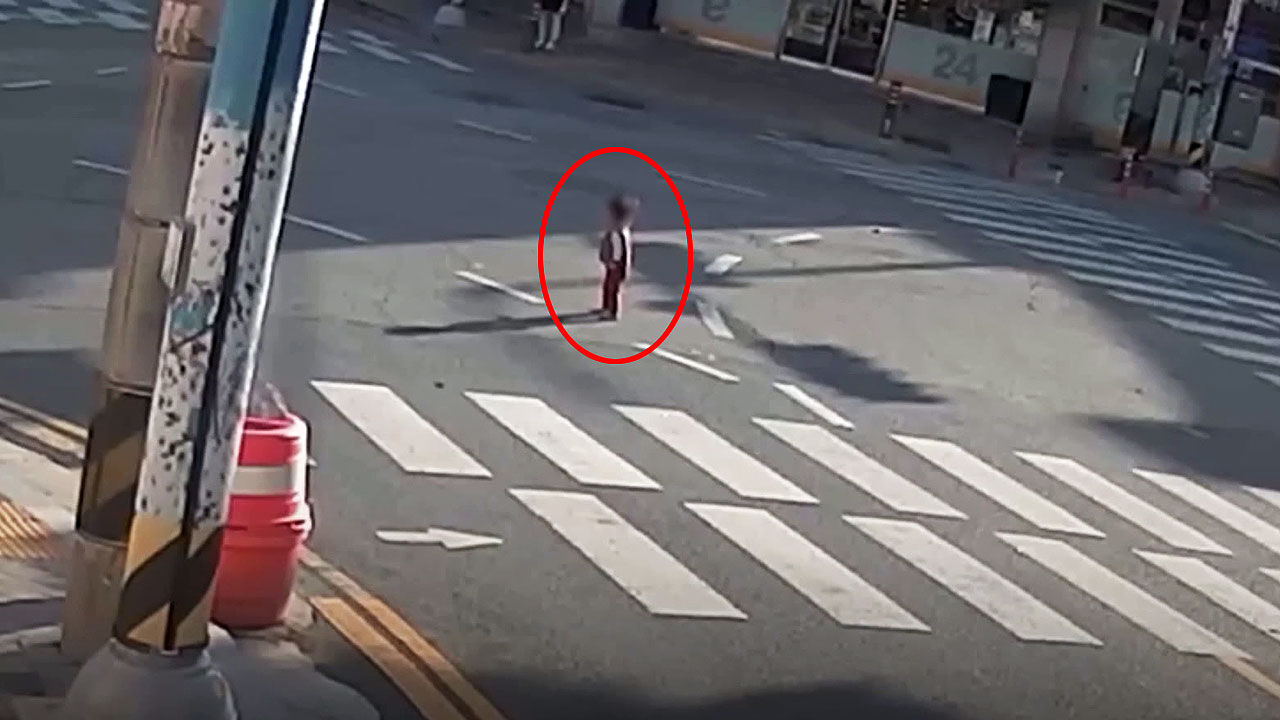 지나가던 시민이 이 모습을 보고 아이를 안아 인도로 데려옵니다.