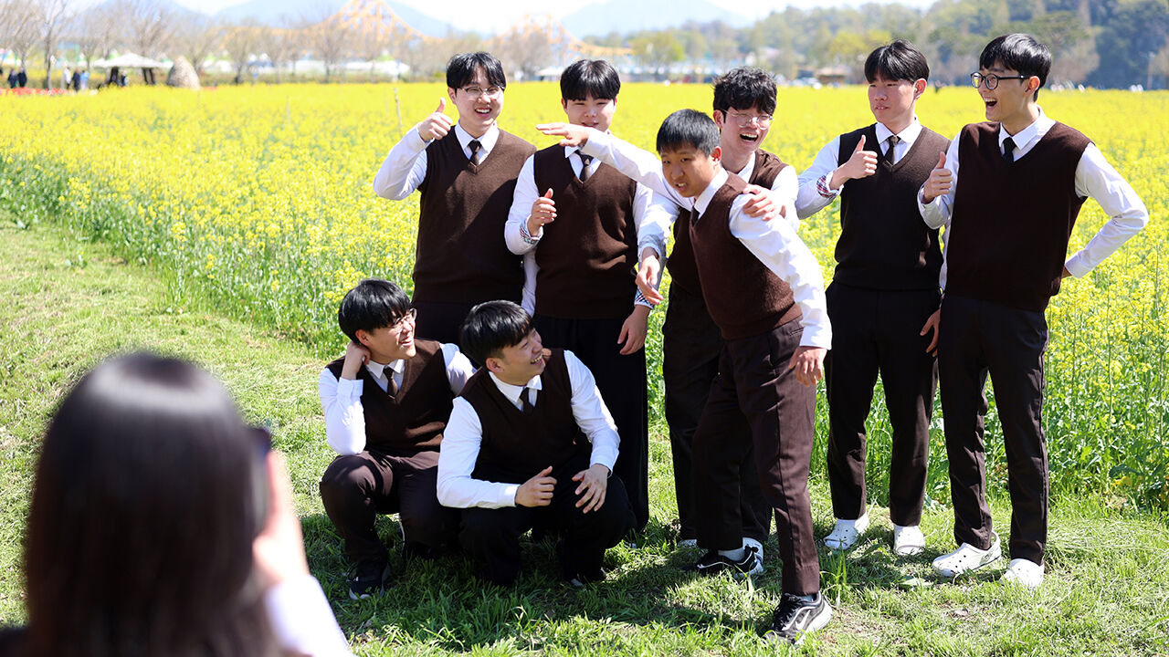 ▲ 지난 8일 오후 경남 창녕군 남지읍 창녕 낙동강 유채단지에서 남지고등학교 학생들이 촬영하고 있다.