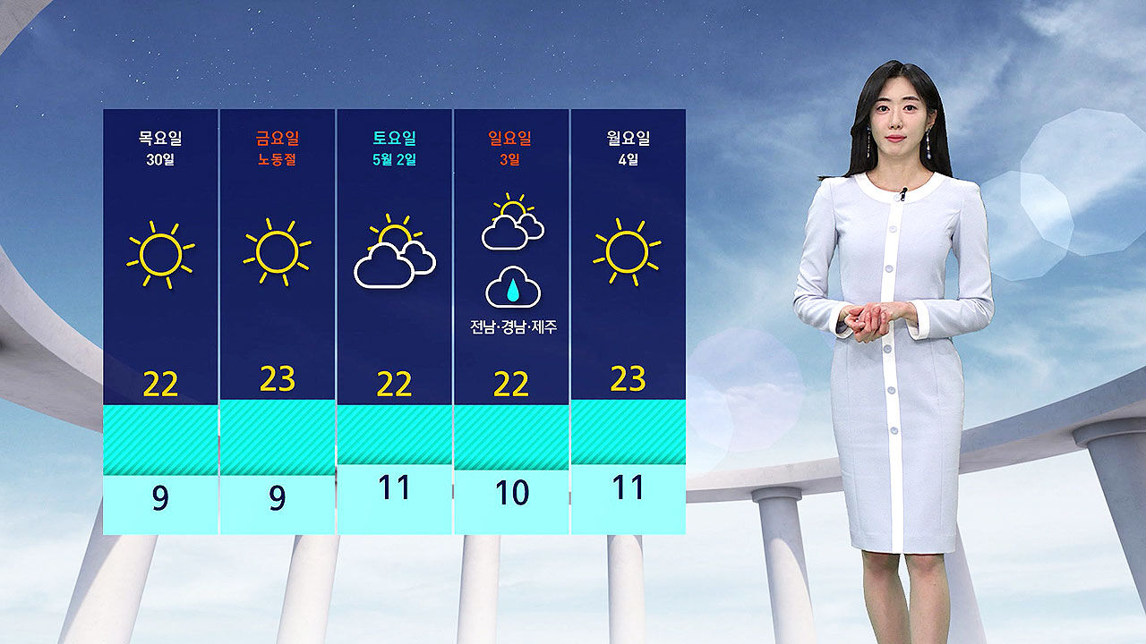 아침에는 쌀쌀하고 낮에는 포근한 가운데 금요일인 노동절까지는 대체로 맑은 날씨가 이어져서 낮 기온도 점진적으로 올라서겠습니다.