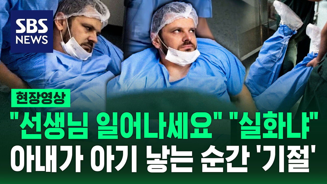 산모의 손을 꼭 잡고 응원하던 남편이 갑자기 중심을 잃고 축 늘어지며 쓰러졌습니다.
