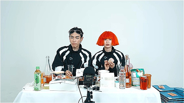 The two wore matching black-and-white sporty outfits and sat across from each other at a table to present ASMR content with a mukbang concept. With cup noodles, pig's trotters, fruit, and snacks laid out on the table, the two watched the music video together while eating. Nana, in particular, added a unique vibe by appearing with an intense orange bob hairstyle.