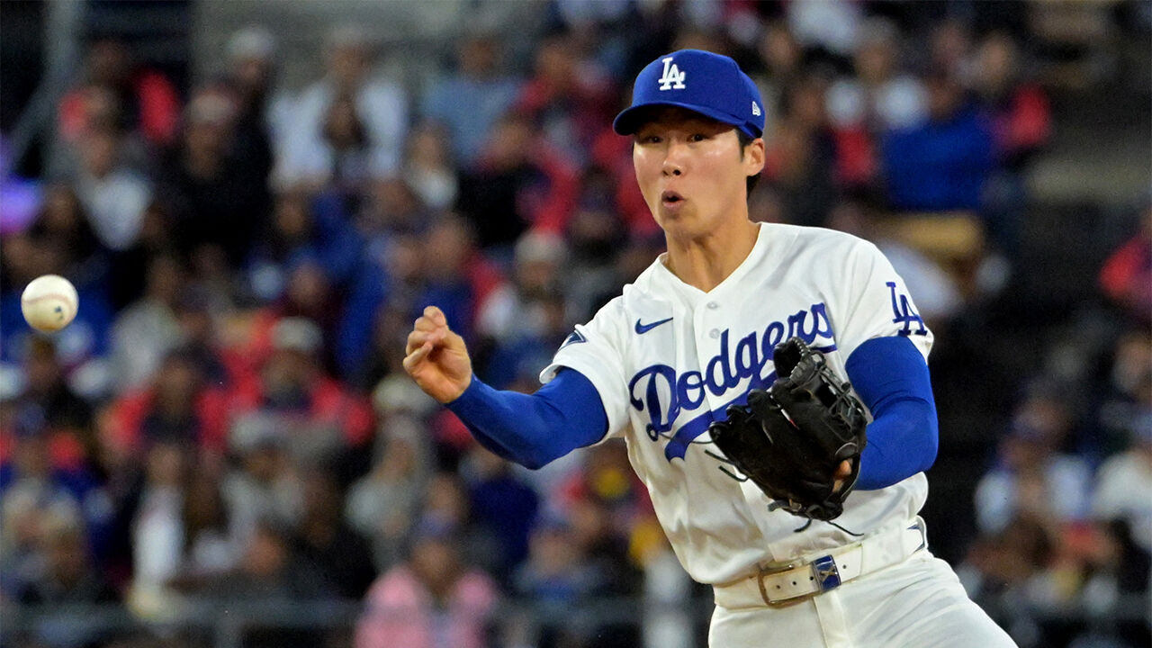 ▲ 1루에 송구하는 다저스 유격수 김혜성