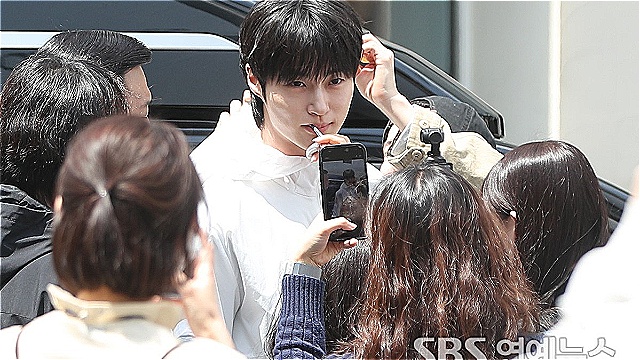 Byeon Wooseok is seen touching up his makeup while attending a fashion brand photo wall event held in Seongsu-dong, Seongdong-gu, Seoul, on the afternoon of April 29.