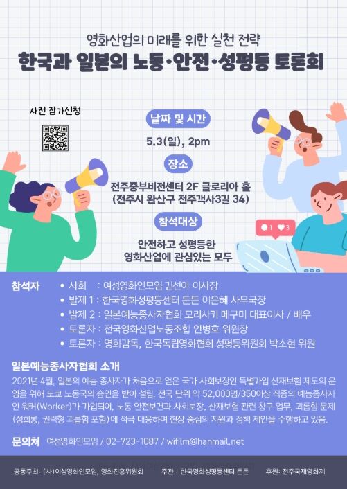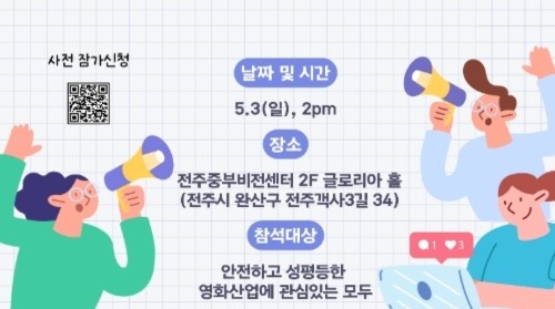 제27회 전주국제영화제 기간 중 열리는 토론회로 오는 5월 3일 전주중부비전센터에서 '영화산업의 미래를 위한 실천전략: 한국과 일본의 노동·안전·성평등 토론회'라는 이름 아래 열린다.