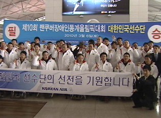 윤석용 장애인 체육회장은 장도에 오르는 선수들에게 격려의 말을 전했고 선수단은 국민들의 응원문구가 담긴 태극기를 전달받은 뒤 또 하나의 밴쿠버 신화를 약속했습니다.