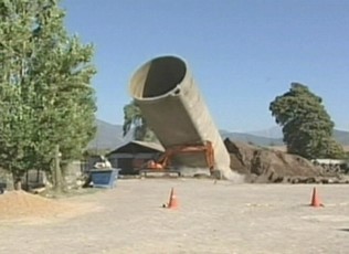 굴삭기가 지반을 건드리자 곡식저장고가 힘없이 무너져 내립니다.