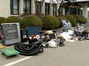 경찰서 앞마당에 벽걸이 TV와 난로, 금고와 같은 생활용품이 널려 있습니다.