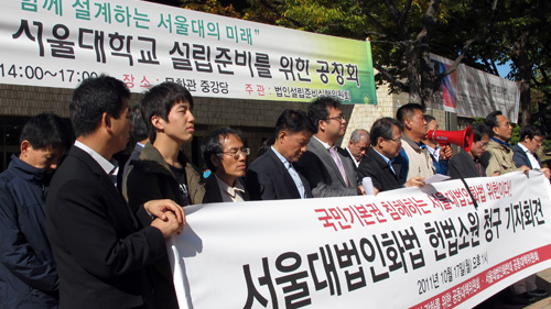 서울대는 20일 오후 2시 교내 법학교육 100주년기념관에서 법인 설립준비 공청회를 열었으나 학생들이 발언을 막고 단상을 점거해 진행을 중단시켰다.
