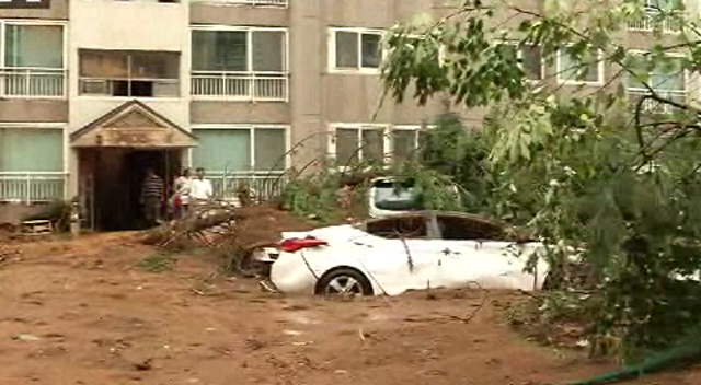 오늘(13일) 새벽 전북 군산 지역에 400mm가 넘는 물폭탄이 쏟아졌습니다. 흙더미가 무너져 내리면서 한 아파트 단지는 완전히 쑥대밭이 됐습니다.