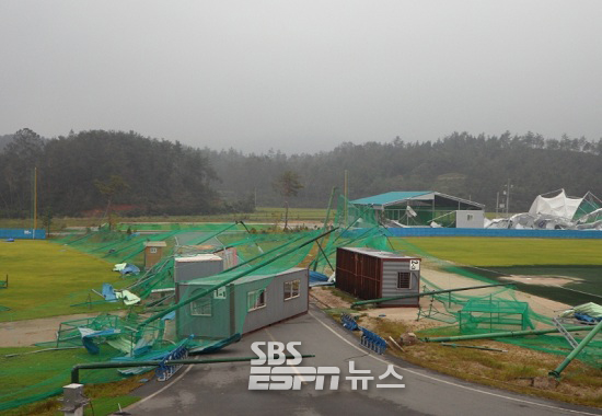 2010년에도 태풍 곤파스에 시설물 피해를 입었던 강진 베이스볼파크는 지난 28일 새벽 불어닥친 강풍과 폭우에 야구장 그물과 기둥이 대부분 쓰러지고, 컨테이너 시설과 실내 연습장 지붕 등도 내려앉는 등의 큰 피해를 입었다. 실내 연습장은 두 동 모두 지붕이 무너져 당장 훈련도 어려운 상황이다.