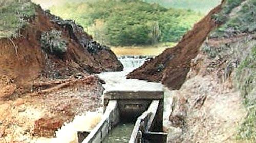 경주시 안강읍 산대 저수지 둑이 터진 것은 오늘(12일) 낮 2시 5분쯤, 콘크리트로 만들어진 수로 주변에 생긴 작은 구멍이 커지면서 둑 중앙 가로 10m, 세로 11m가 가량이 유실된 겁니다.