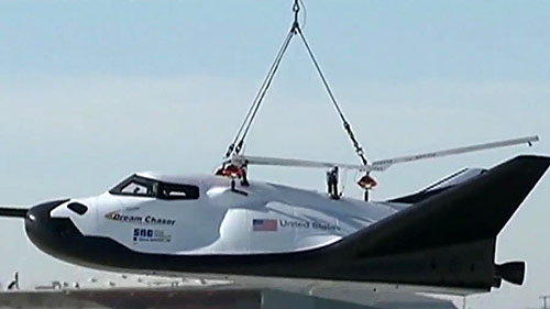 '우주 택시'가 헬기에 매달려 하늘 높이 올라가고 있습니다.
