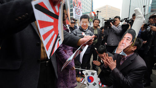어버이연합, 납북자 가족모임 등 보수단체 회원들이 1일 오후 서울 중학동 일본대사관 앞에서 아베 신조 일본 총리의 탈을 쓰고 박근혜 대통령, 시진핑 중국 국가주석 탈을 쓴 사람들에게 일본 과거사와 관련 사죄하는 퍼포먼스를 하고 있다. (서울=연합뉴스)