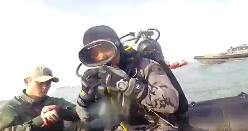 해군 소속 잠수사들이 세월호 수색 작업을 마치고 바지선 위로 올라옵니다.