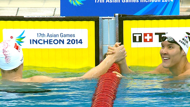 23일 오전 문학박태환수영장에서 열린 2014 인천 아시안게임 경영 남자 자유형 400m 예선전에서 박태환이 전체 3위로 결선에 진출했습니다. 쑨양과 함께 예선 3조에서 경기한 박태환은 3분 53초 80을 기록해 쑨양에 2.63초 뒤진 조 2위로 터치 패드를 찍었습니다.