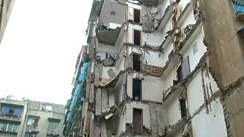 아파트가 갈라지면서 복도에 위험하게 고립된 한 여성을 구하기 위해 구조대원이 안간힘을 씁니다.