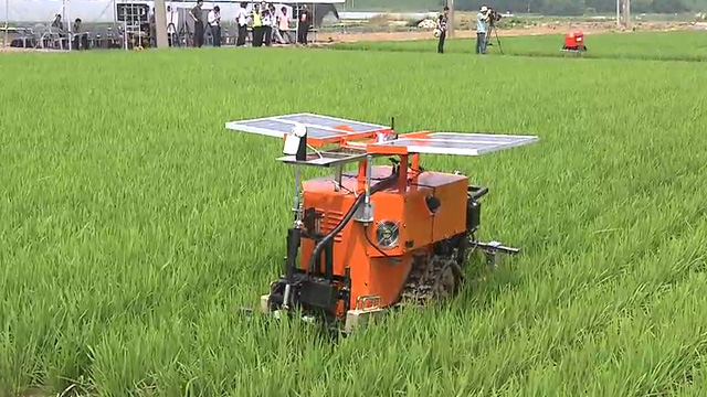 요즘 농촌에서는 고령화로 일손이 모자란 데다 농약을 쓰지 않는 친환경 벼 재배지역이 많아지면서 잡초가 골치인 데 슈퍼 일꾼이 등장했습니다. 로봇 일꾼인데요, 하루 종일 일을 해도 끄떡없고 제초율도 80% 가 넘는다고 합니다.