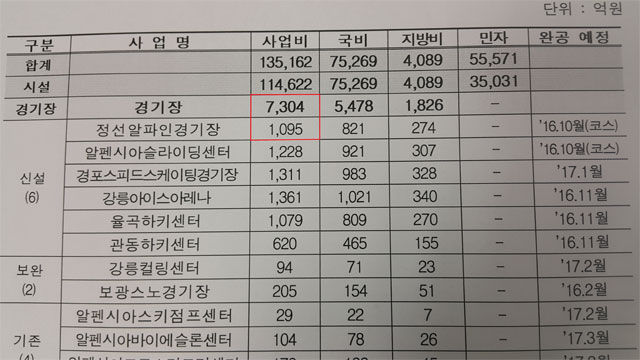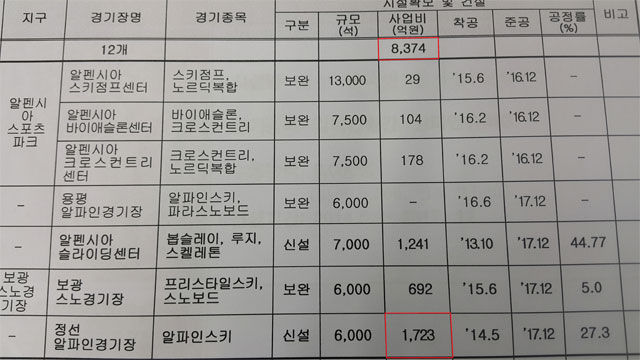 이틀 동안 현장 취재를 하면서 이 경기장의 건설비가 대폭 증가한 점을 새로 발견할 수 있었습니다. 2014년 1월 강원도가 작성한 공식 문서에 따르면 정선 알파인 경기장의 사업비는 1,095억 원입니다. 1년이 지난 2015년 3월 문화체육관광부의 자료에도 역시 1,095억 원으로 돼 있습니다.