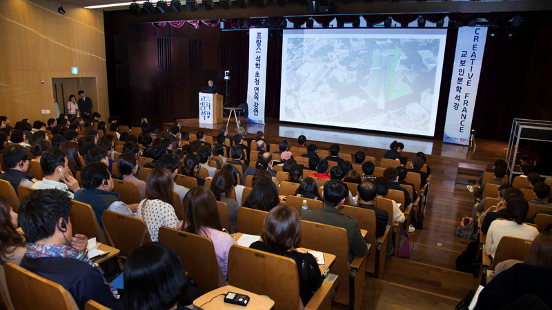 대부분이 젊은이들인 청중을 고려해선지 지난 2008년 준공된 이화여대 캠퍼스 설계 이야기로 강연을 시작했습니다. 페로가 설계자로 결정된 뒤 이화여대는 프랑스 설계사에게서 ‘프랑스식 정원’이 만들어질 것을 기대했습니다.