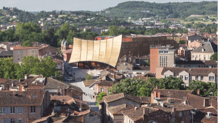 그가 자연과 조화를 예로 들며 설명한 또 다른 건축물은 프랑스 알비(ALBI)시의 대극장. 알비는 프랑스 남부 랑그독 지방에 있는 중세 도시로 붉은색 연와를 사용한 붉은 시가지가 유네스코 문화 유산으로 지정된 곳입니다. 붉은 지붕 집들이 빼곡이 들어선 가운데 페로는 황금색 지붕의 대극장을 건설했습니다. 자신의 머플러를 예로 들면서 붉은색 의상에 황금색 머플러를 두른 것이라고 설명했습니다.