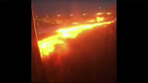 2백여 명의 승객이 탄 항공기에 큰불이 나는 아찔한 상황이 포착됐습니다.