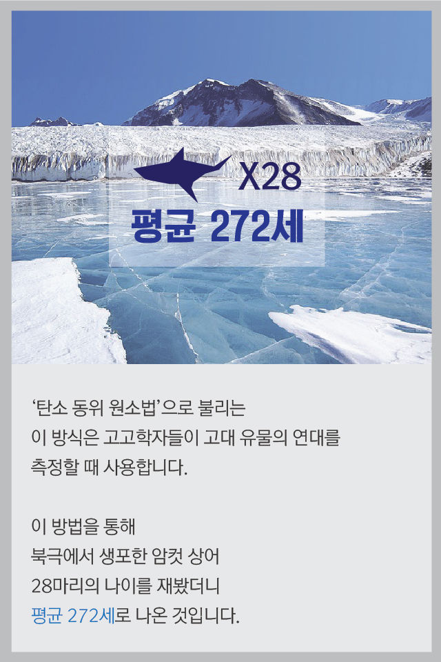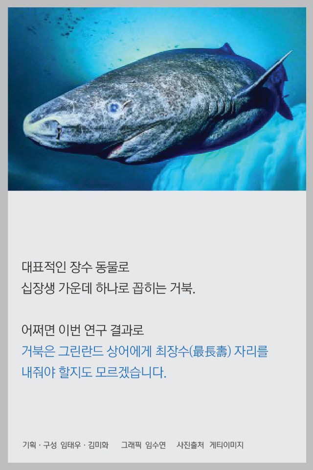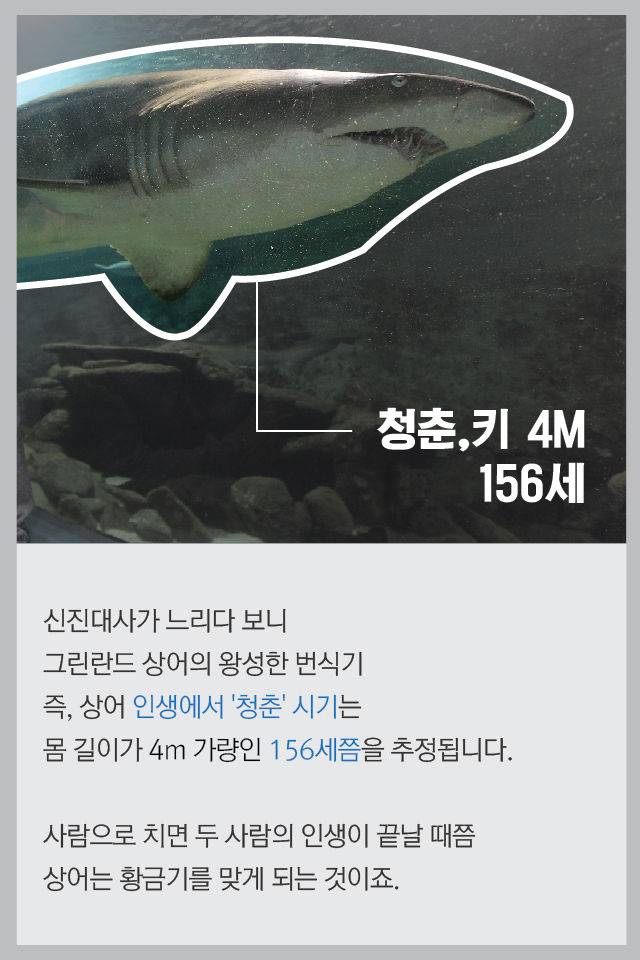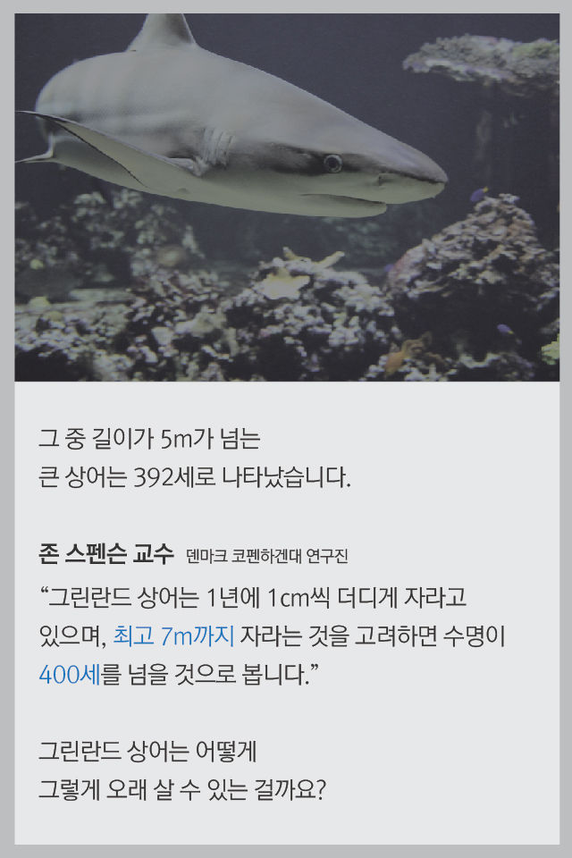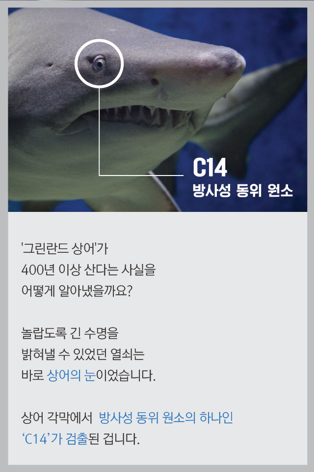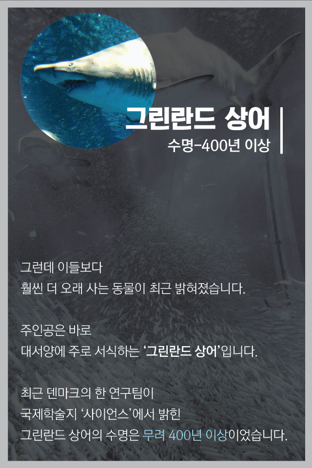 지난 12일, 국제학술지 사이언스는 사람과 같은 척추동물 중에서도 가장 오래 사는 동물을 발표했습니다. 세계 최장수 척추동물 중에서도 400년 이상을 사는 것으로 밝혀진 ‘그린란드 상어’ 입니다. 상어의 각막 속에 ‘탄소 동위 원소(C14)’ 측정을 통해 밝혀낸 연구결과라고 합니다. 이는 본래 고고학자들이 고대 유물의 연대를 측정할 때, 주로 사용되던 방식이었습니다. 그렇다면, 그린란드 상어가 이토록 오래 살 수 있는 이유는 무엇인지 살펴봤습니다. (기획·구성 : 임태우·김미화 / 디자인: 임수연)
