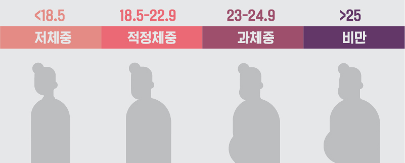 한국인은 BMI 0~18.4면 저체중, 18.5∼22.9가 적정체중, 23∼24.9는 과체중, 25 이상부터 비만으로 판정됩니다.