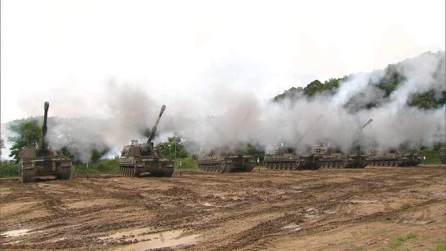 K-9 사격 훈련에는 포 1문당 포 반장, 사수와 부사수, 1번 포수, 조종수 등 5명이 탑승합니다.