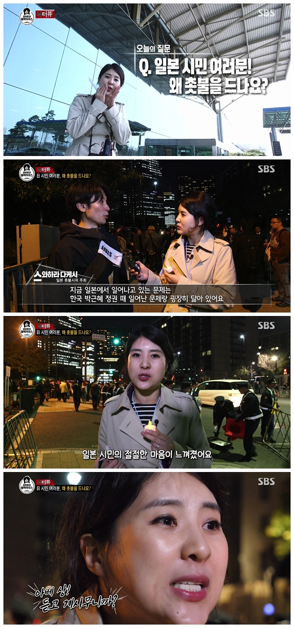 강유미는 스튜지오에서 일본 촛불 집회에 다녀온 비하인드를 전하기도. “지금까지 취재와 달랐다. 흑터뷰 아니라 백터뷰다 했다. 어떤 분들은 눈물 흘리더라. 처음엔 왜 우시나 했는데 ‘너무 오랫동안 한 정당이 집권했다. 아무도 우리 이야기를 언론에서 내보내지 않는데 외국에서 보도해주니까 고맙다’고 하더라”라고 이야기 했다.
