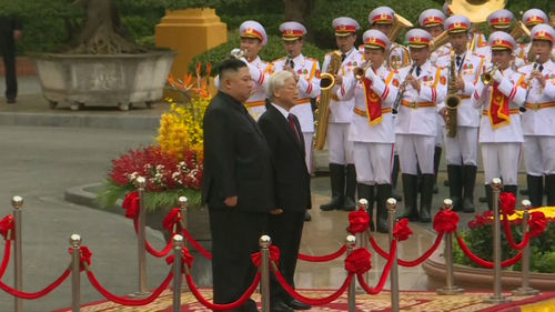 김 위원장의 차량 행렬은 사이드카의 호위를 받으며 오후 3시 반 하노이 바딘광장에 있는 베트남 주석궁에 도착했고 이후 환영행사가 이어졌습니다.