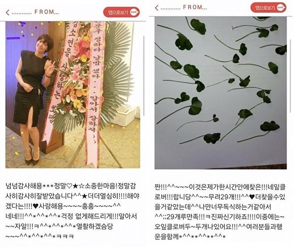 과거 김소연이 팬카페에 직접 남긴 글에는 "소중한 마음! 감사히 잘 받았습니다^^★ 사랑해용~~~홍홍~~^^", "여러분들과 행운을 함께*^^*" 등 다정한 내용이 담겨있었는데요, 김소연은 직접 찍은 네잎클로버 사진을 올리는 등 활발한 소통을 이어가며 팬들에게 넘치는 애정을 표현했습니다.