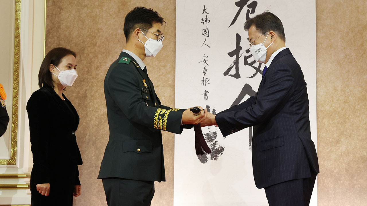 문 대통령은 "국가에 위태로움이 오지 않도록 살피고, 국가가 위기에 처하면 이를 극복하는 데 앞장서 달라"며 "대한민국의 장군이자 한반도 평화의 첨병이 되어 달라"고 말했습니다.