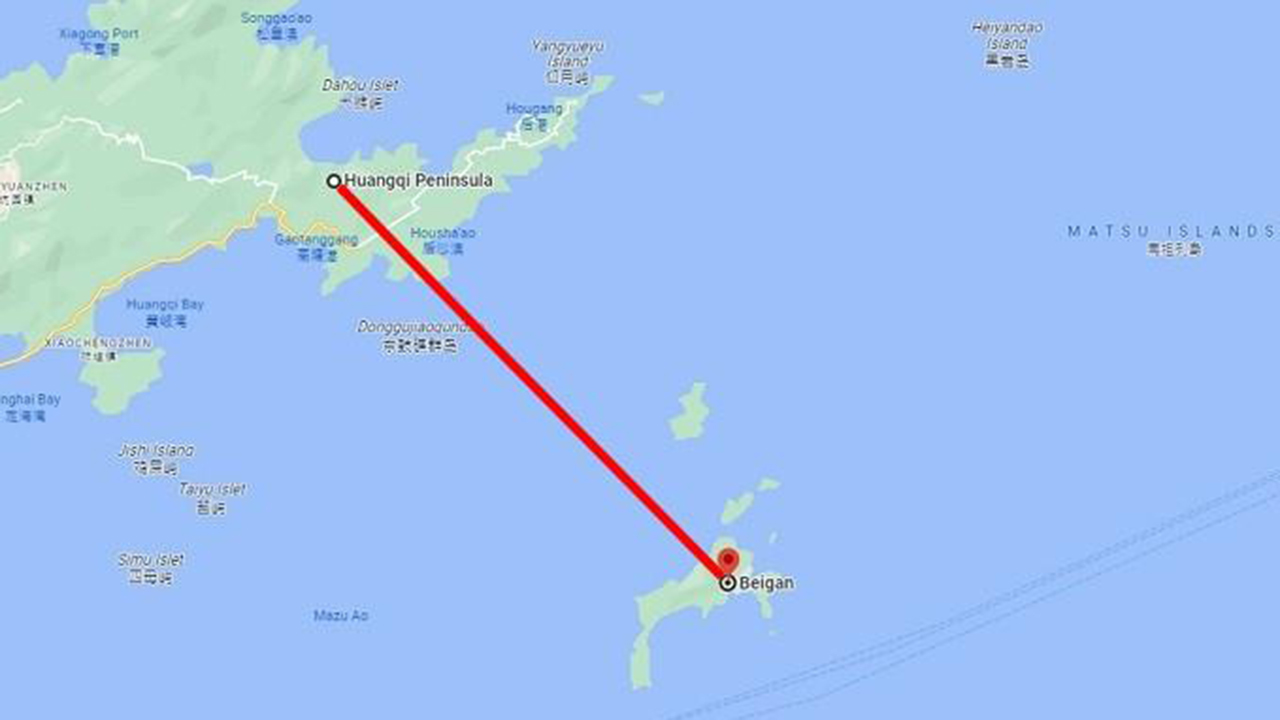 ▲ 중국 푸젠성 황치반도에서 타이완 외곽 섬 베이간다오까지 거리