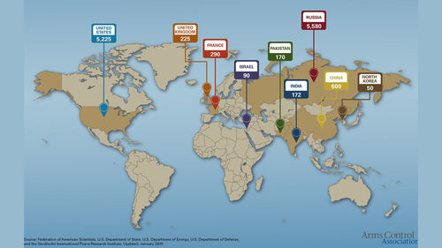 미국 싱크탱크인 군비통제협회의 1월 업데이트에 따르면 현재 전 세계에는 1만 2,400개의 핵무기가 있으며 이 가운데 90% 가까이를 미국(5,225개)과 러시아(5,580개)가 보유하고 있습니다.