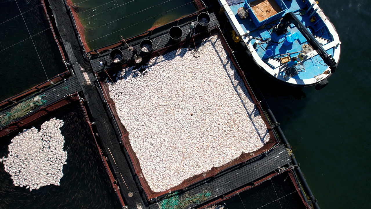 유해성 적조생물의 점액질이 아가미에 들러붙어 도망칠 곳 없는 양식어류를 질식사하게 만듭니다.
