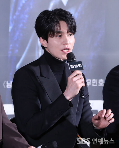 Actor Lee Dongwook attended the production showcase for the film 'Harbin' at CGV Yongsan I'Park Mall in Seoul on the morning of Nov. 27, taking questions and chatting with the press.