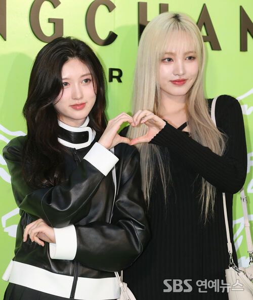 IVE's Gaeul (left) and Liz attended Longchamp's photocall in Seongsu-dong, Seoul, on Sept. 26, striking sweet heart-hands poses for the cameras.